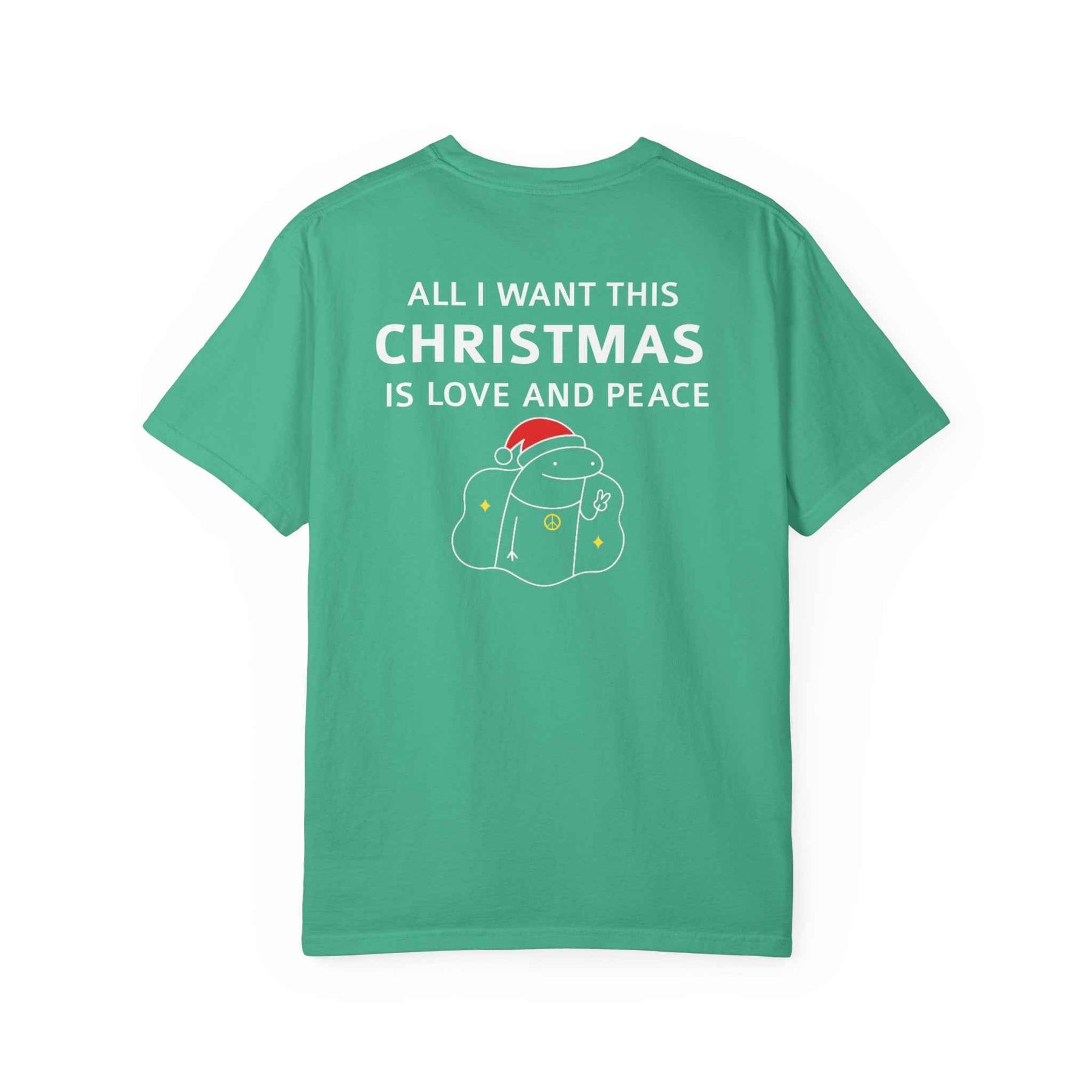 Soft, lived-in tee that carries a gentle holiday spirit. The front pops with playful HO HO lettering, ornaments and a cozy Santa hat — bright, cheerful, and a little nostalgic. On the back, a sweet, hand-drawn gift box and the line “All I want this Christmas is love and peace” turn the shirt into a quiet reminder to slow down and celebrate what matters. Wear it to low-key gatherings, neighborhood caroling, or while wrapping gifts at the kitchen table. The garment-dyed finish gives each shirt a mellow, broken-in color and a comfy feel from the first wear, while the relaxed cut layers easily under sweaters or over long sleeves when the weather turns. Thoughtful, simple, and sincere — this tee feels like an honest holiday hug.