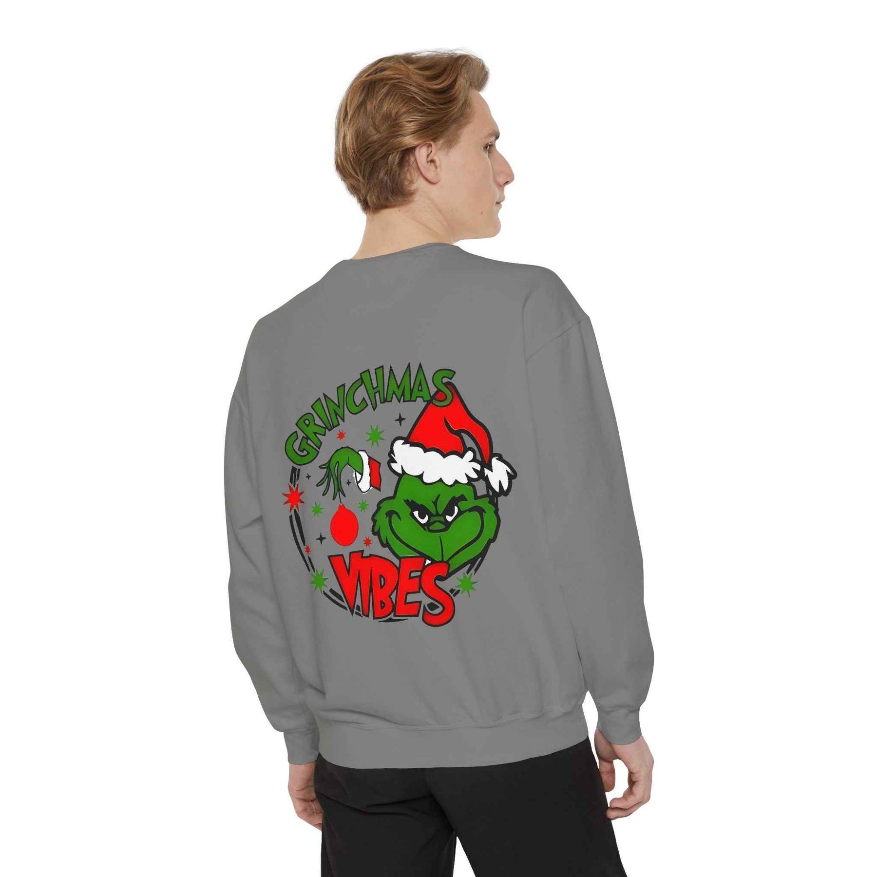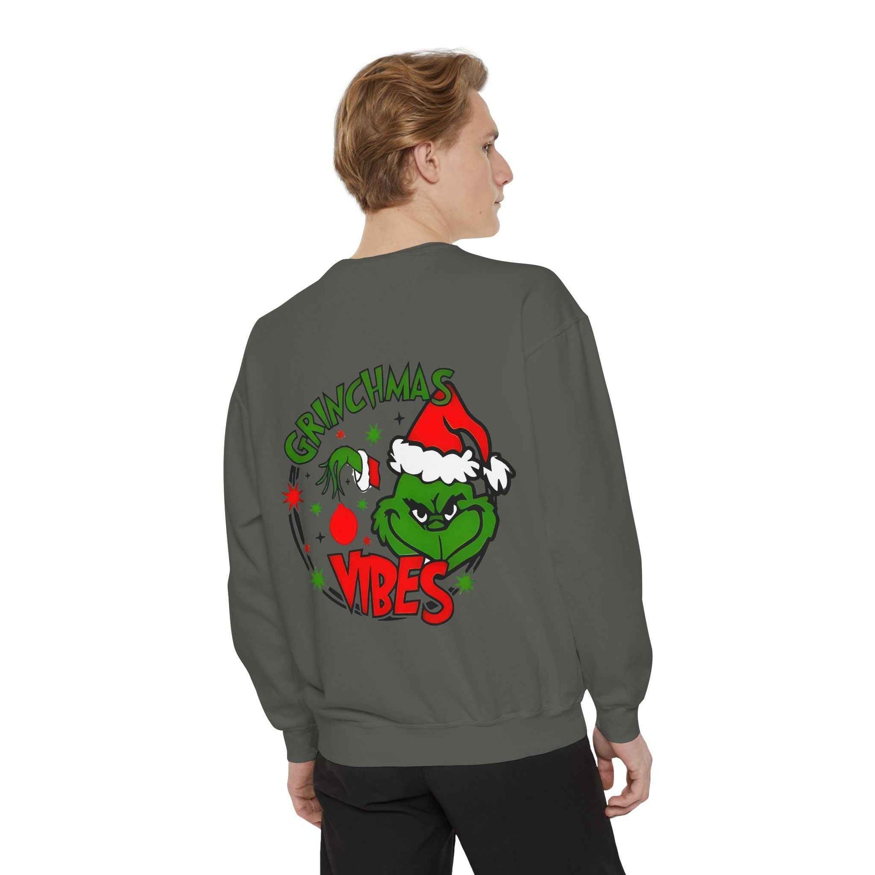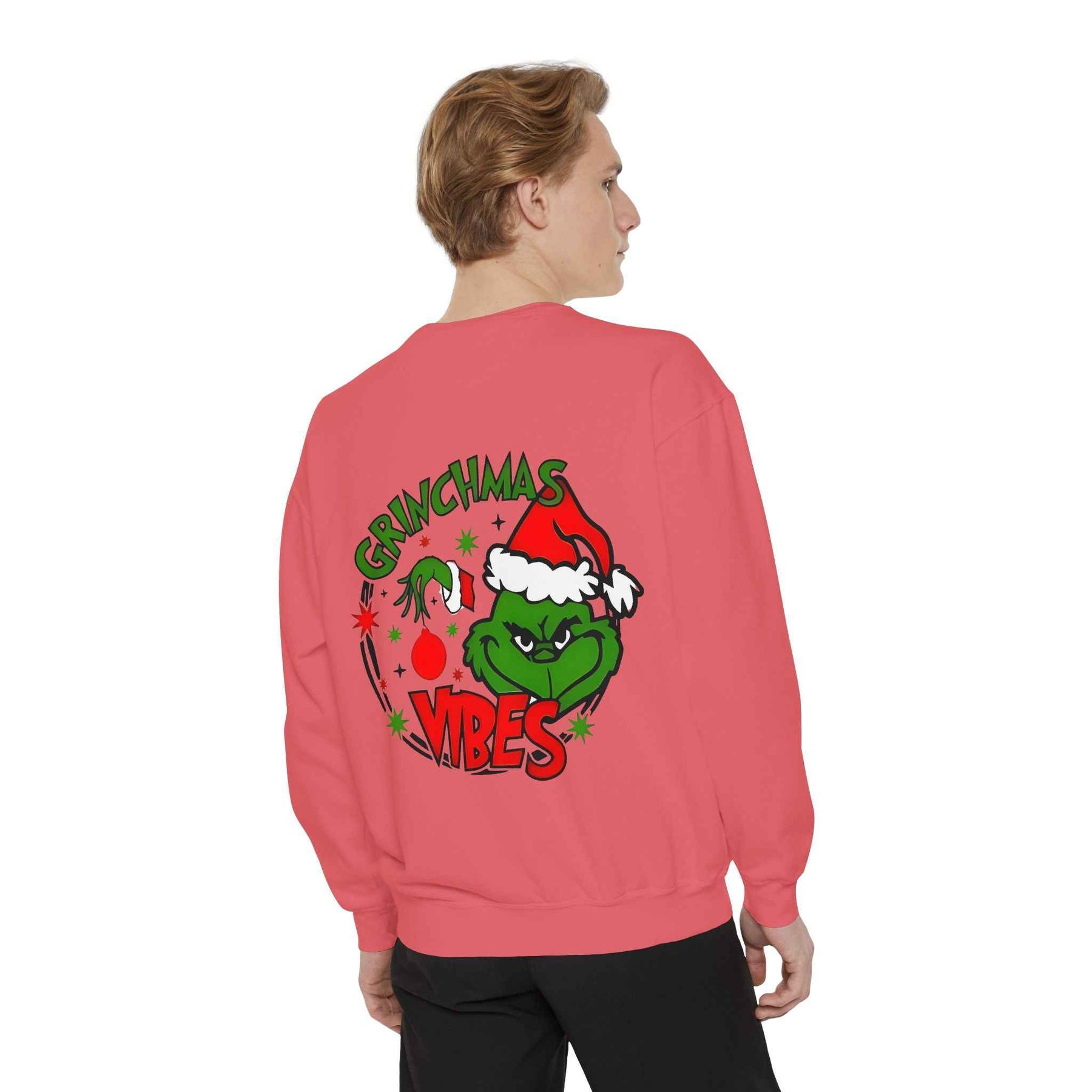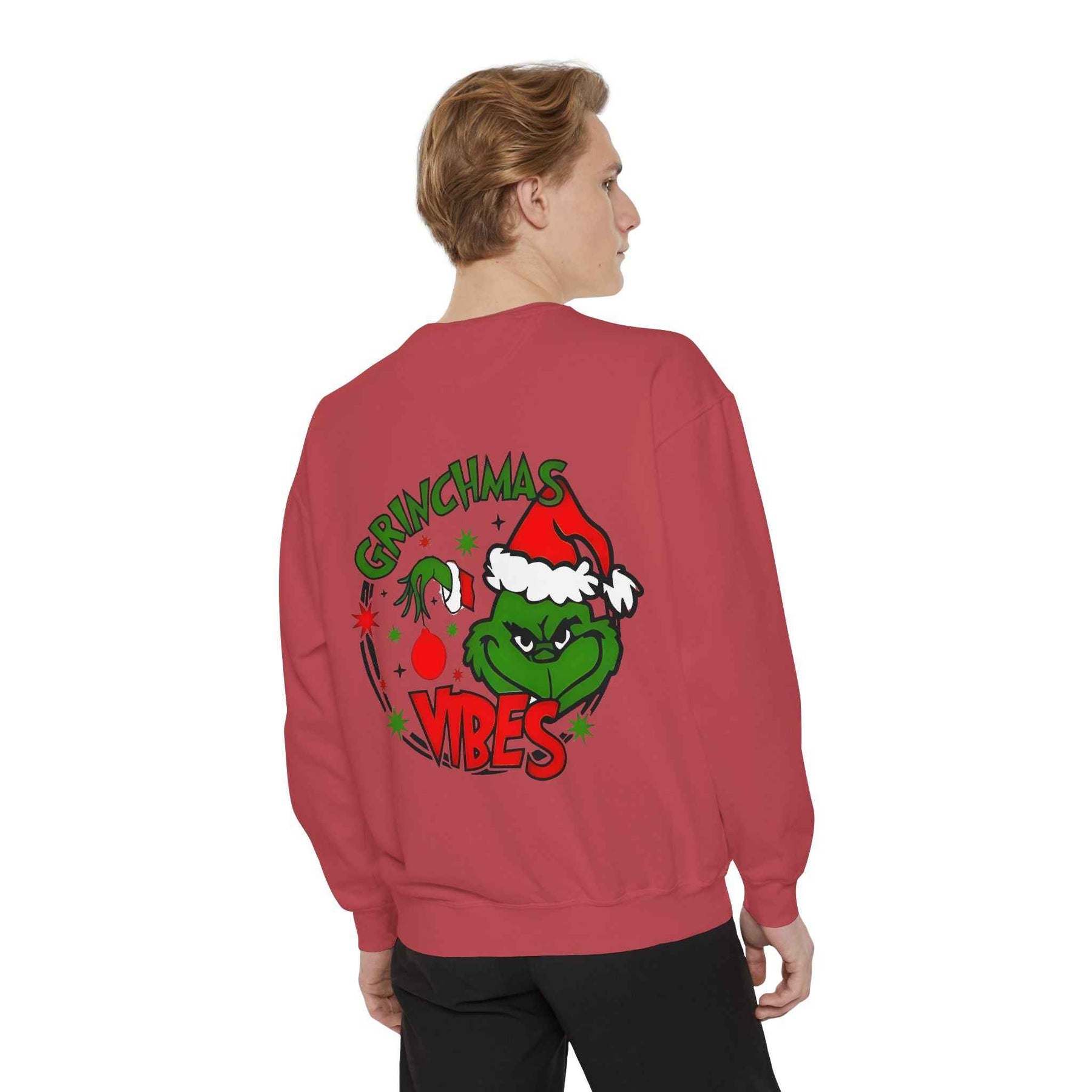 This relaxed-fit sweatshirt brings a playful, slightly mischievous holiday mood to quiet nights by the tree and loud living-room dance-offs. The front greets guests with a stitched “Merry Christmas,” while the back leans into cheeky energy with “Grinchmas Vibes” — a wink to anyone who loves holiday humor without losing cozy charm. The medium-heavy ring-spun cotton blend feels soft against the skin and holds printed or embroidered artwork with clean edges. Wear it to late-night cookie baking, neighborhood light tours, or low-key office parties; it layers easily under a coat or stands alone as the evening’s statement piece. Subtle details like the half-moon neck patch, ribbed cuffs and hem, and twill neck tape keep the sweatshirt comfortable and long-lasting, while OEKO-TEX low-impact dyes give the color a lived-in, garment-dyed look that ages beautifully.