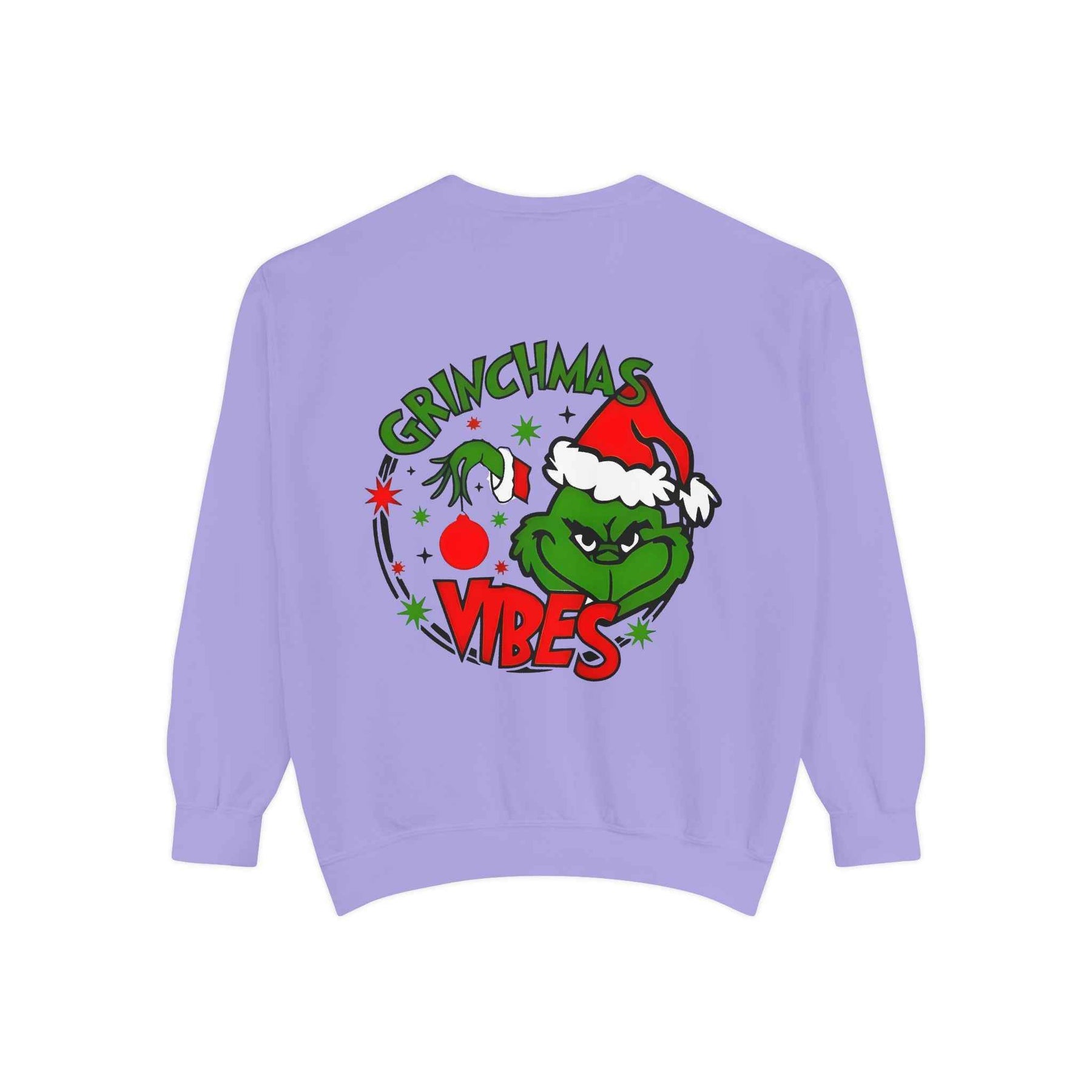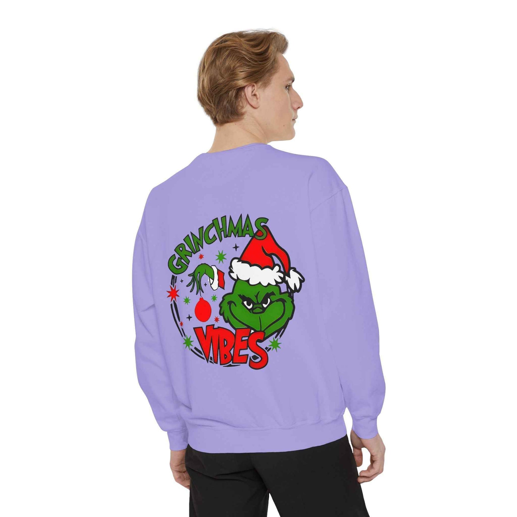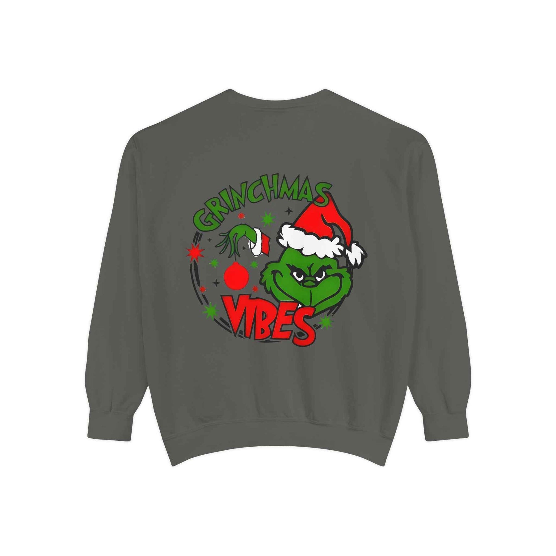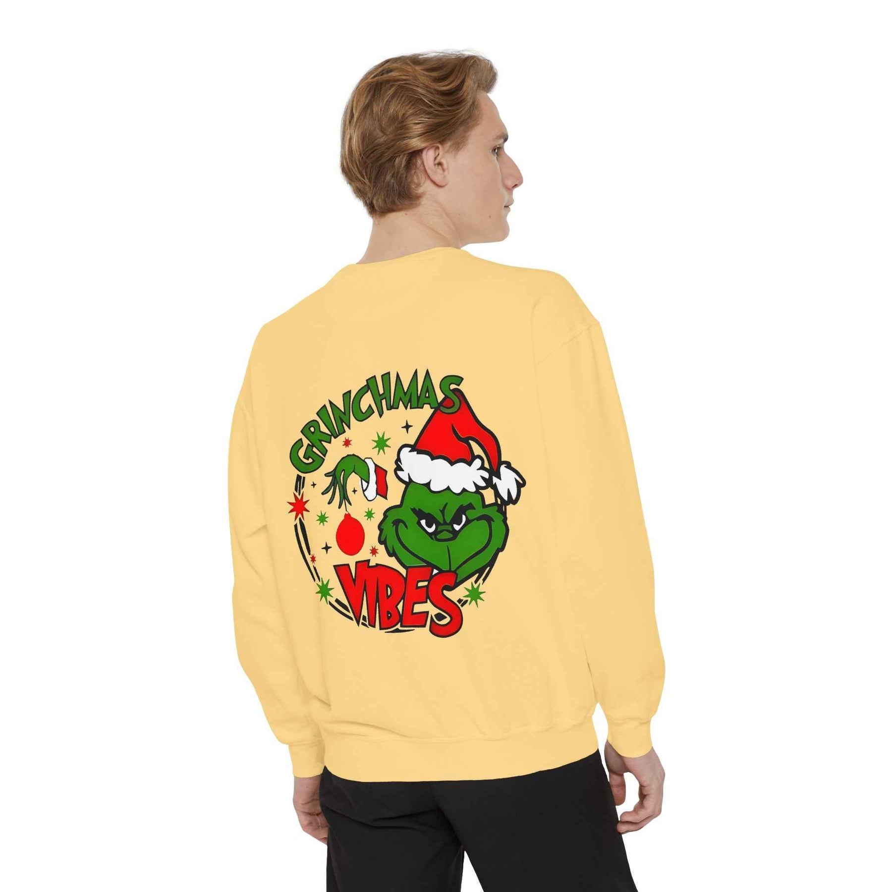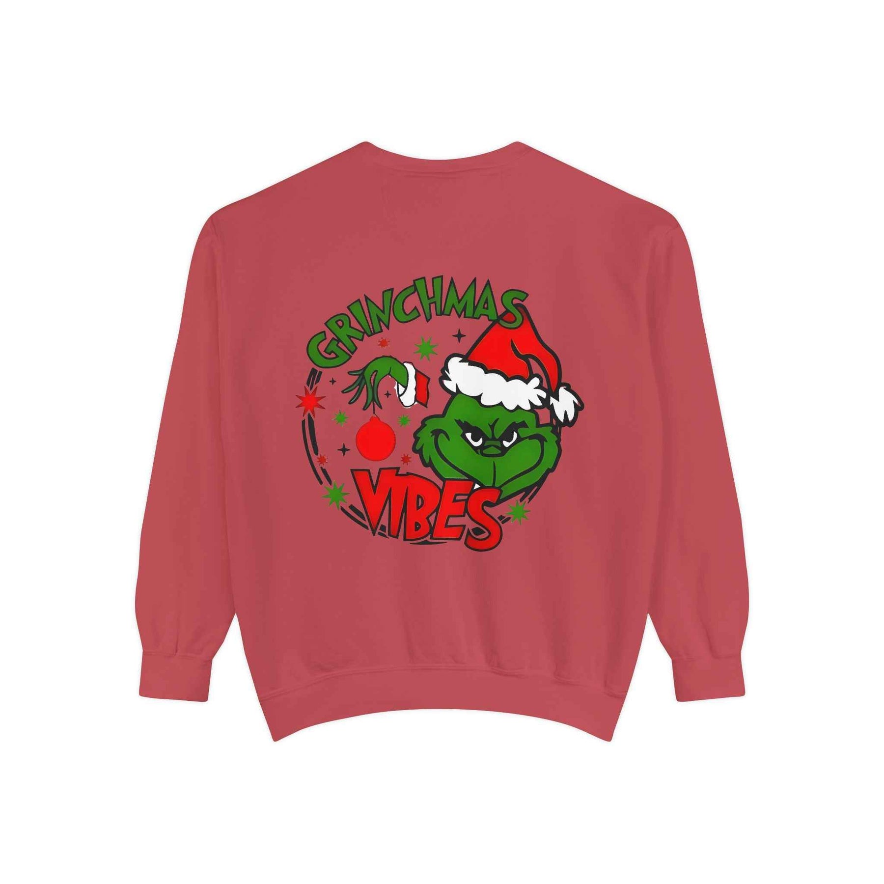 This relaxed-fit sweatshirt brings a playful, slightly mischievous holiday mood to quiet nights by the tree and loud living-room dance-offs. The front greets guests with a stitched “Merry Christmas,” while the back leans into cheeky energy with “Grinchmas Vibes” — a wink to anyone who loves holiday humor without losing cozy charm. The medium-heavy ring-spun cotton blend feels soft against the skin and holds printed or embroidered artwork with clean edges. Wear it to late-night cookie baking, neighborhood light tours, or low-key office parties; it layers easily under a coat or stands alone as the evening’s statement piece. Subtle details like the half-moon neck patch, ribbed cuffs and hem, and twill neck tape keep the sweatshirt comfortable and long-lasting, while OEKO-TEX low-impact dyes give the color a lived-in, garment-dyed look that ages beautifully.