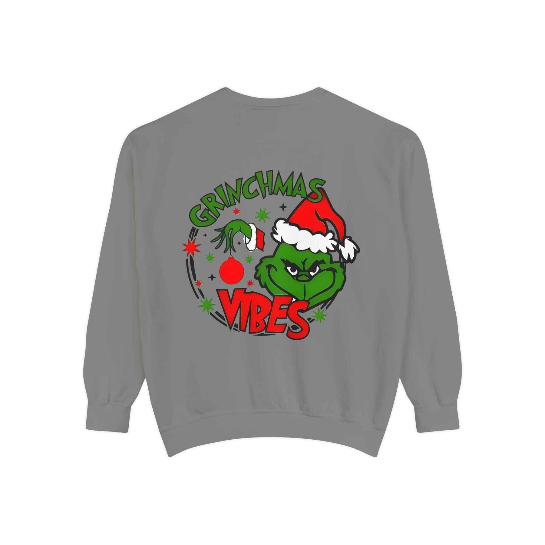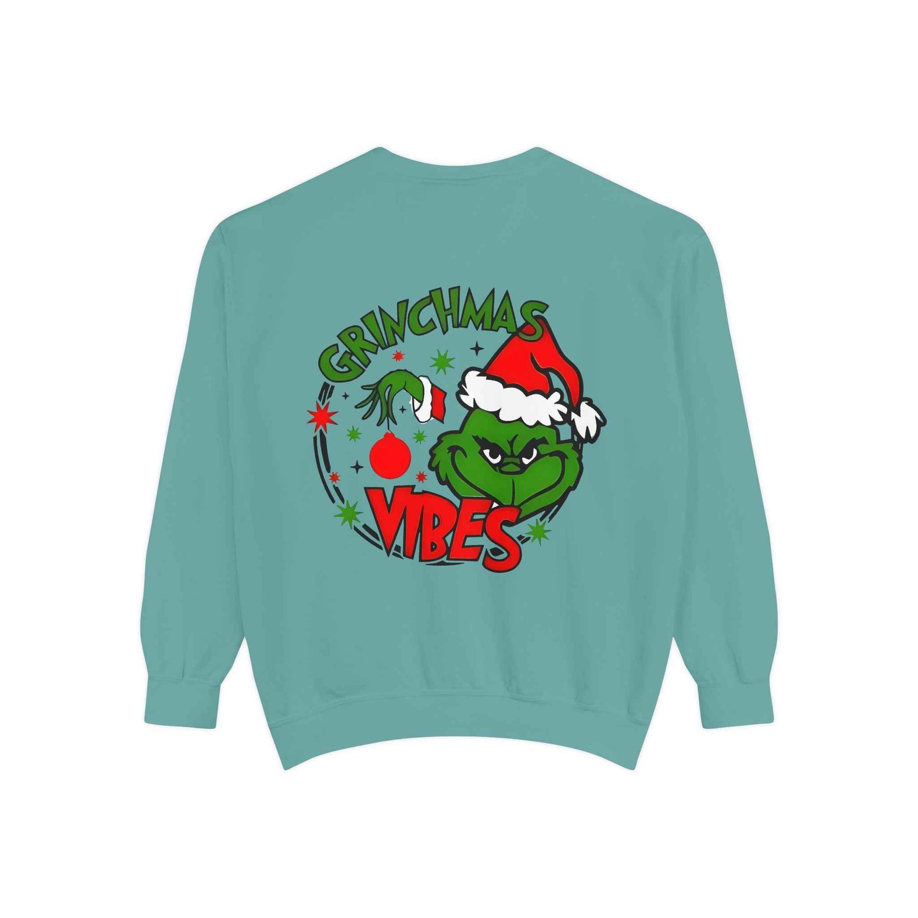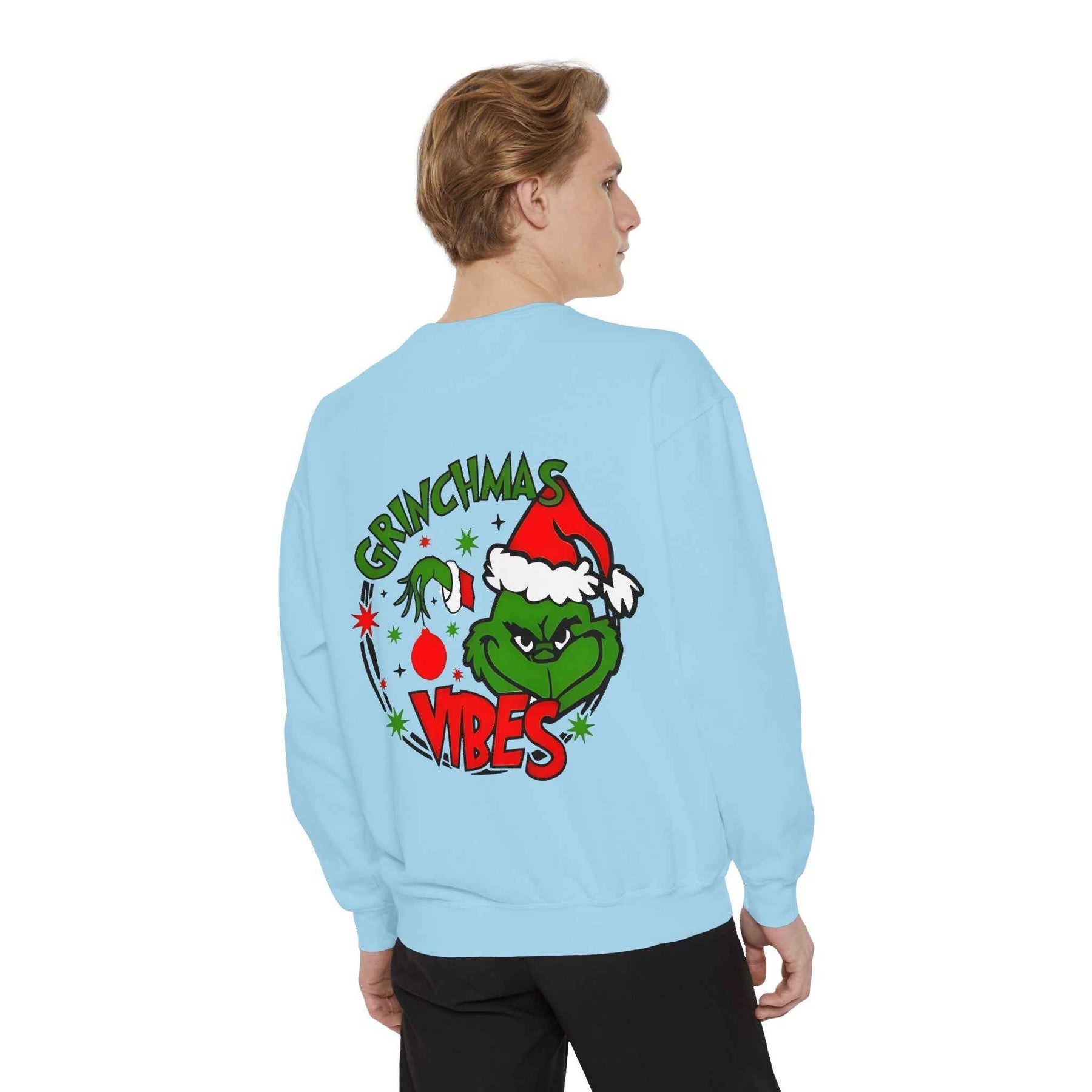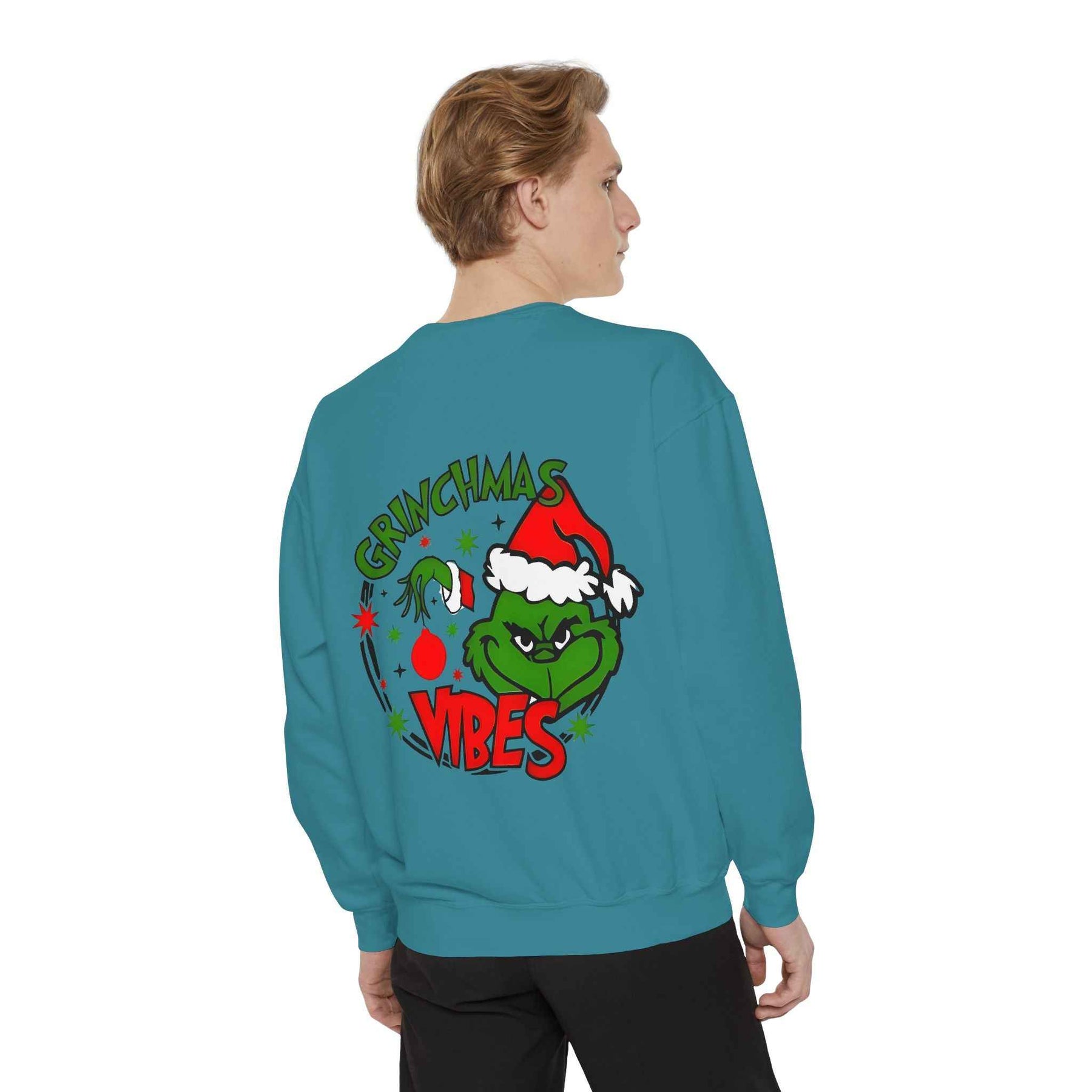 This relaxed-fit sweatshirt brings a playful, slightly mischievous holiday mood to quiet nights by the tree and loud living-room dance-offs. The front greets guests with a stitched “Merry Christmas,” while the back leans into cheeky energy with “Grinchmas Vibes” — a wink to anyone who loves holiday humor without losing cozy charm. The medium-heavy ring-spun cotton blend feels soft against the skin and holds printed or embroidered artwork with clean edges. Wear it to late-night cookie baking, neighborhood light tours, or low-key office parties; it layers easily under a coat or stands alone as the evening’s statement piece. Subtle details like the half-moon neck patch, ribbed cuffs and hem, and twill neck tape keep the sweatshirt comfortable and long-lasting, while OEKO-TEX low-impact dyes give the color a lived-in, garment-dyed look that ages beautifully.