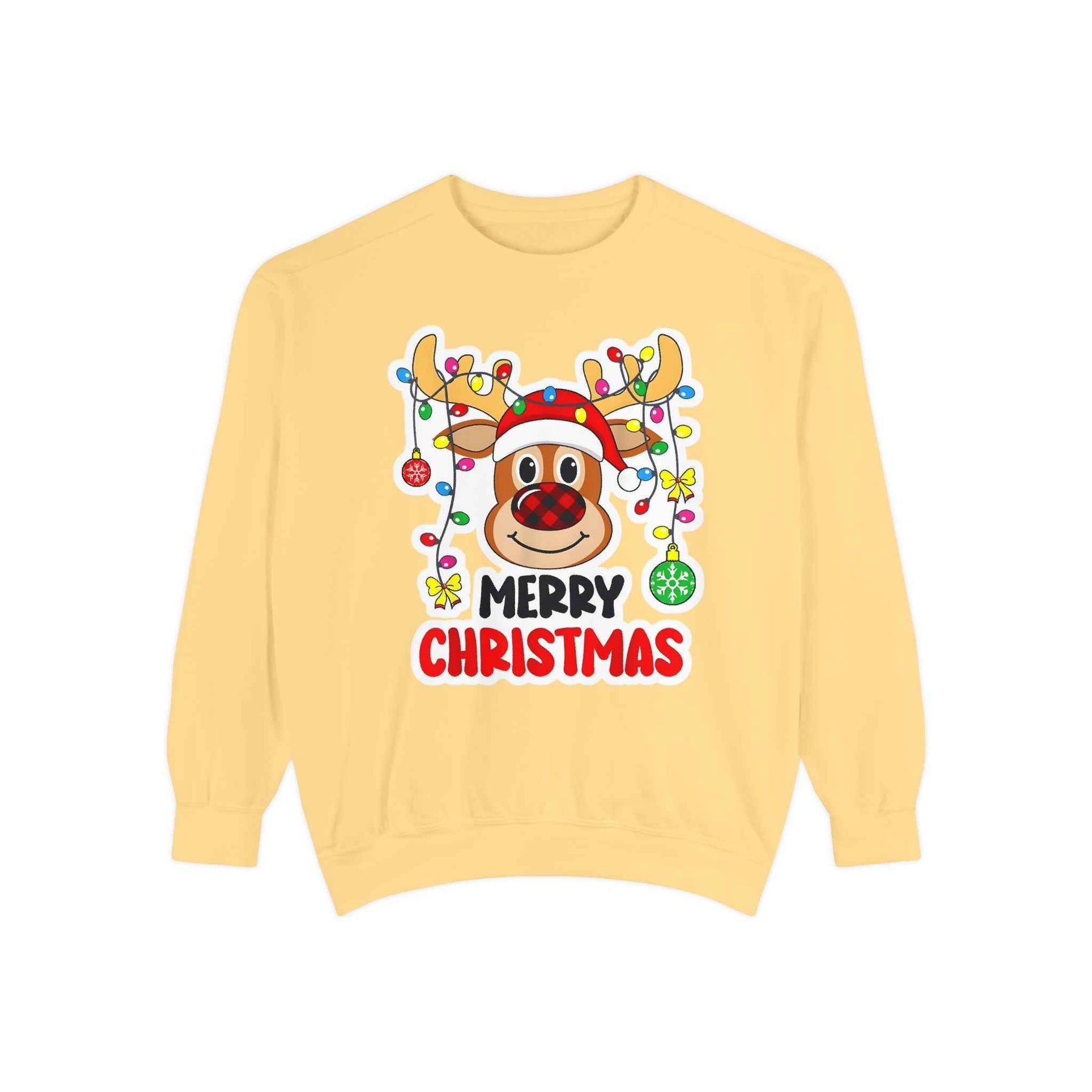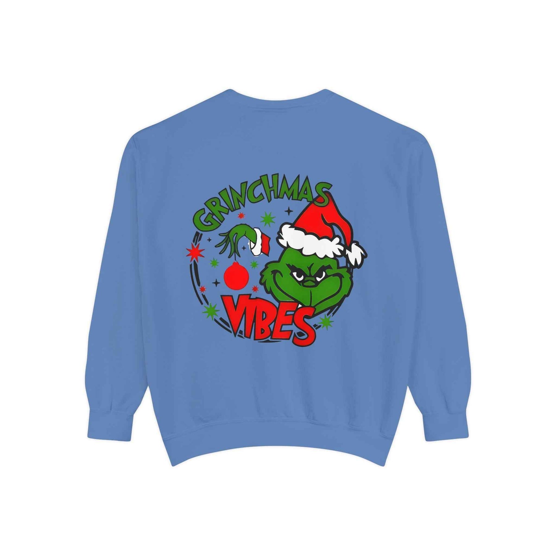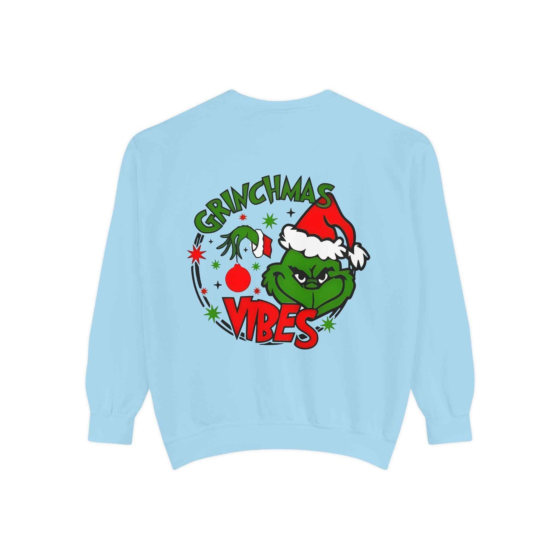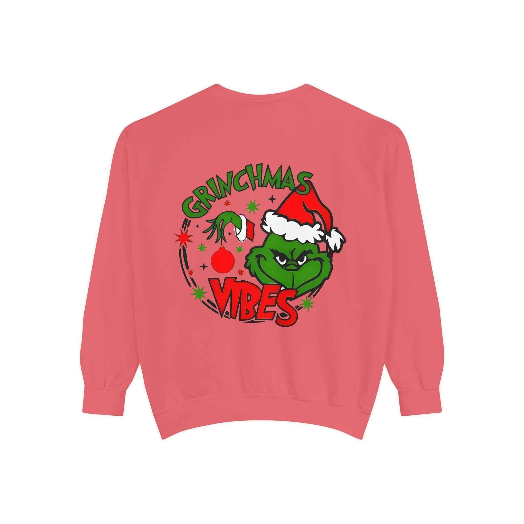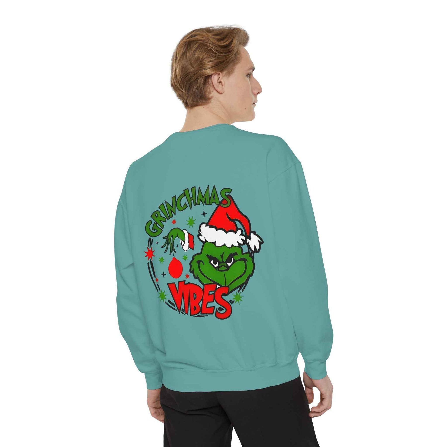 This relaxed-fit sweatshirt brings a playful, slightly mischievous holiday mood to quiet nights by the tree and loud living-room dance-offs. The front greets guests with a stitched “Merry Christmas,” while the back leans into cheeky energy with “Grinchmas Vibes” — a wink to anyone who loves holiday humor without losing cozy charm. The medium-heavy ring-spun cotton blend feels soft against the skin and holds printed or embroidered artwork with clean edges. Wear it to late-night cookie baking, neighborhood light tours, or low-key office parties; it layers easily under a coat or stands alone as the evening’s statement piece. Subtle details like the half-moon neck patch, ribbed cuffs and hem, and twill neck tape keep the sweatshirt comfortable and long-lasting, while OEKO-TEX low-impact dyes give the color a lived-in, garment-dyed look that ages beautifully.