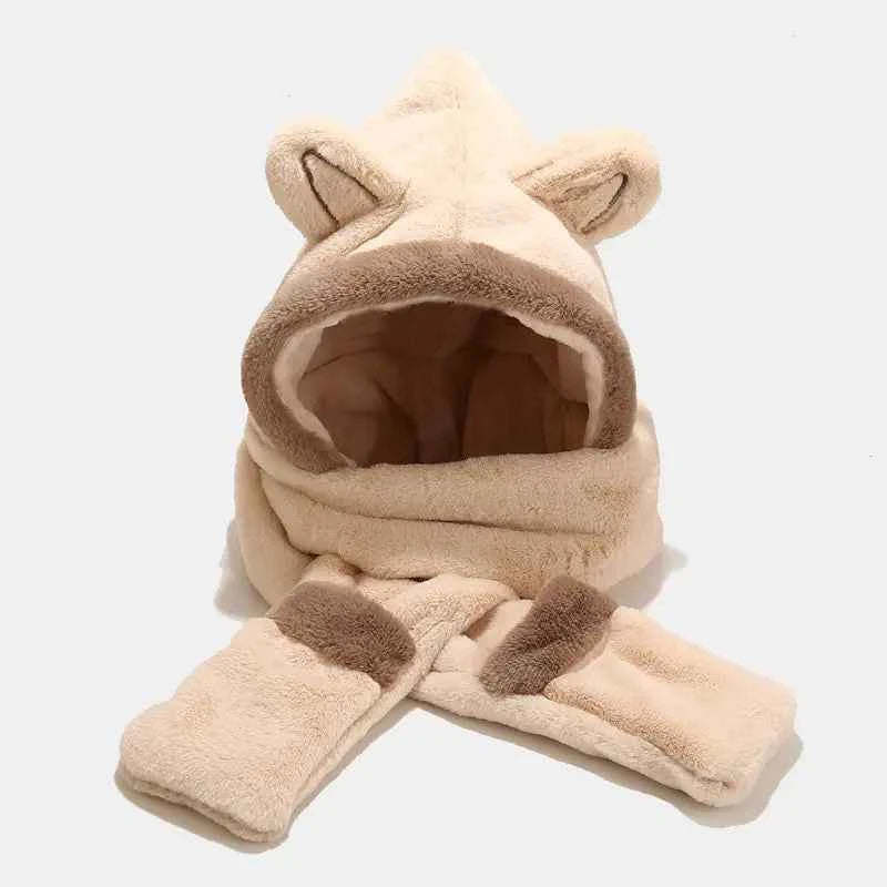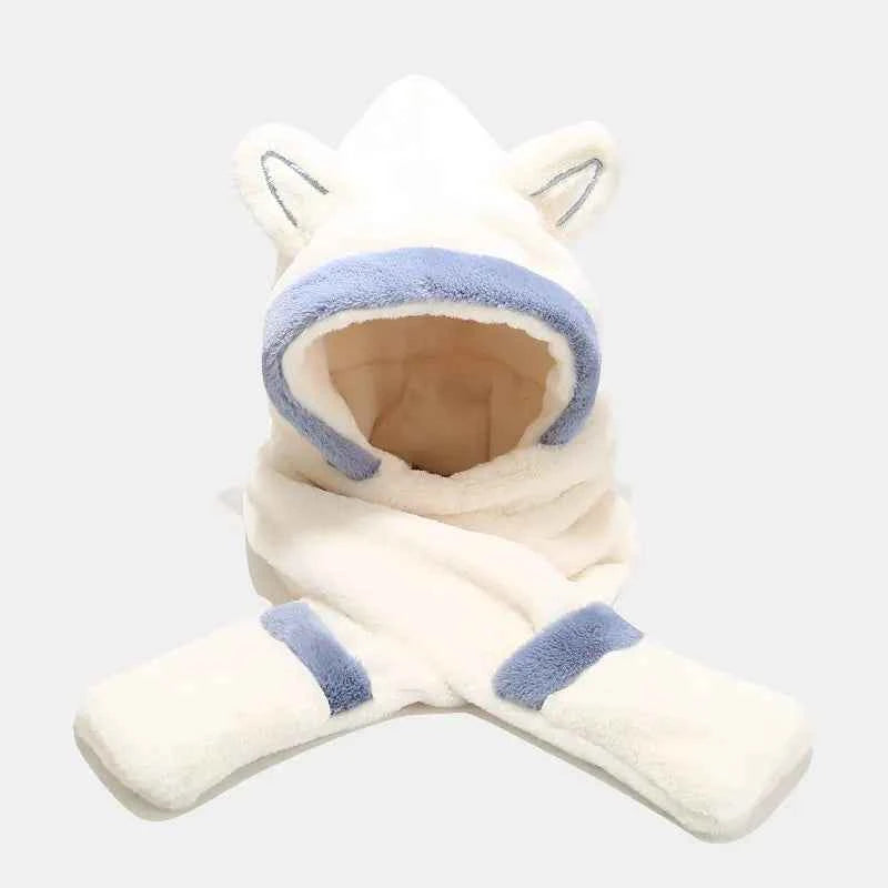 Stay warm and cute with this super-soft imitation rabbit fur set. Features a plush winter hat with adorable cat ears, integrated scarf, and mittens. Available in beige, blue, khaki, pink, and white—perfect for cold weather and adding a playful touch to any outfit.